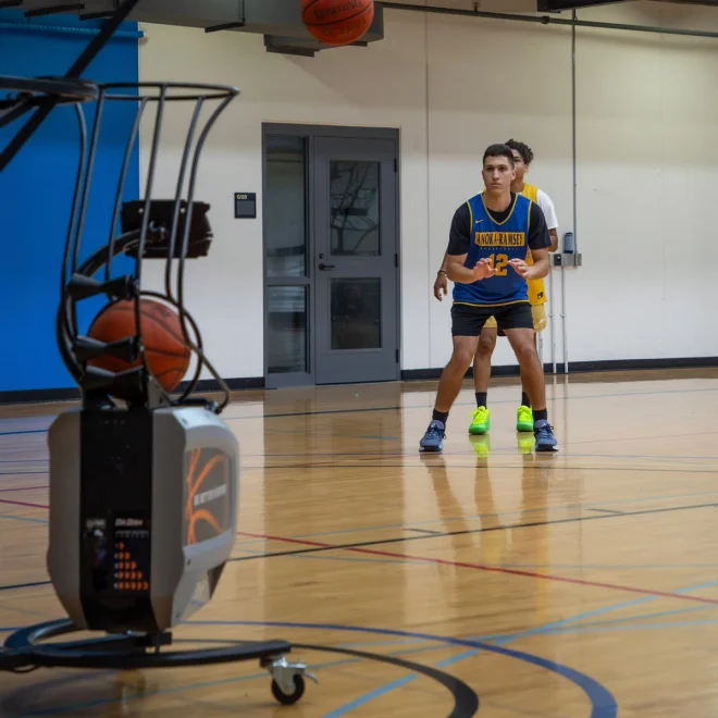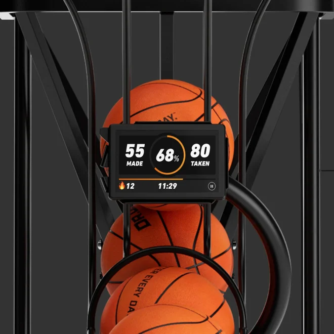 Our fully automatic and programmable shooting machine tracks your makes and attempts. Build and save your own custom drills (even out of order to get players on the move), all with an updated, modern design that includes an 8″ HUD touchscreen.